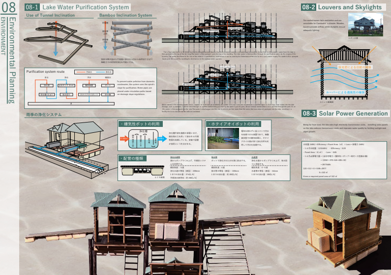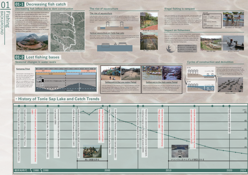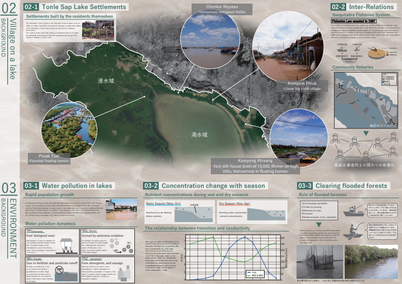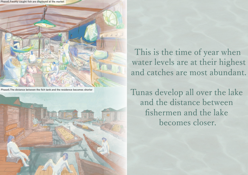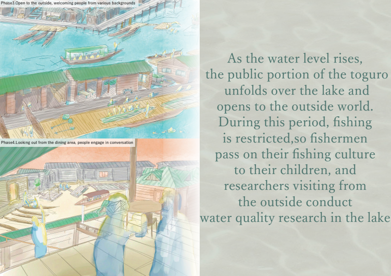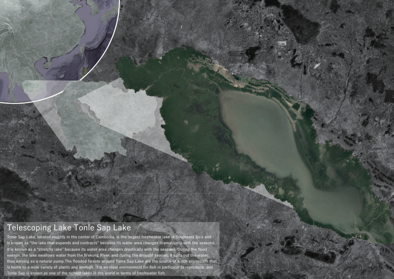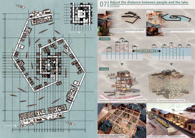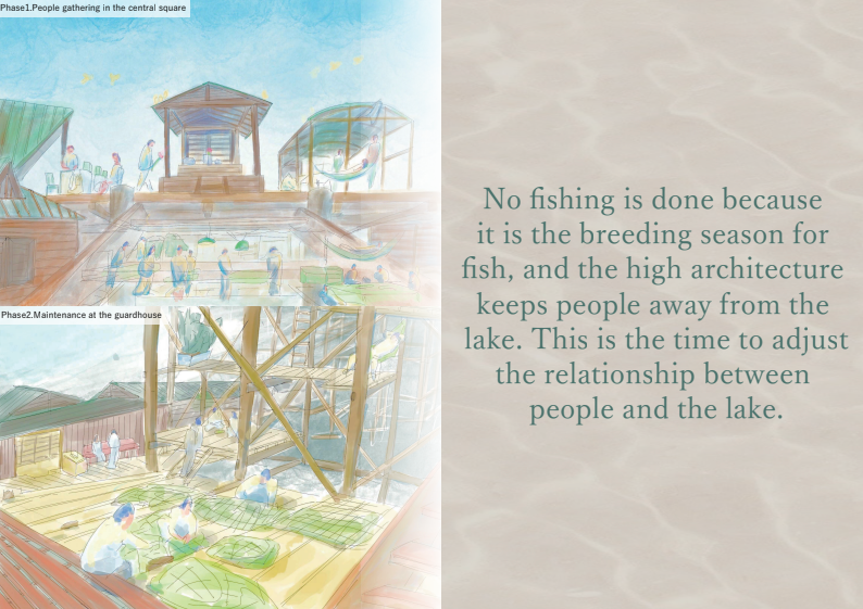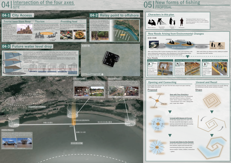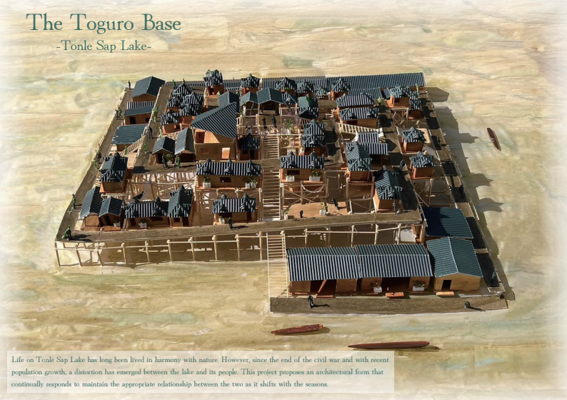 カンボジアのトンレサップ湖では水位の変化と共に漁民の生活が営まれてきたが、近年の環境破壊により人と自然の関係が崩れている。本計画は、水位や生態に応じて形を変える“とぐろ型漁業拠点”によって、季節ごとに漁民と湖の関わり方を変えることで、人と湖の共生関係を再構築する。