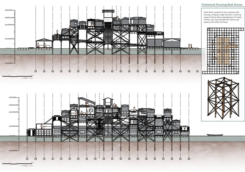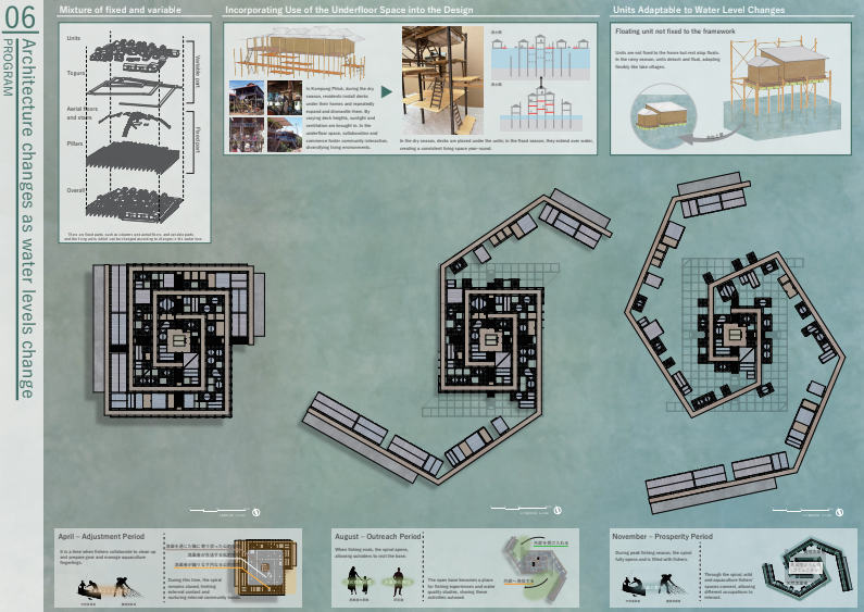 Fishing communities around Cambodia’s Tonle Sap Lake have long adapted their lives to the lake’s fluctuating water levels, but recent environmental degradation has disrupted the balance between people and nature. This project proposes a “spiral-shaped fishing hub” that adapts its form according to water levels and ecological cycles, reconfiguring how fishermen interact with the lake throughout the seasons to rebuild a sustainable relationship between humans and the lake.