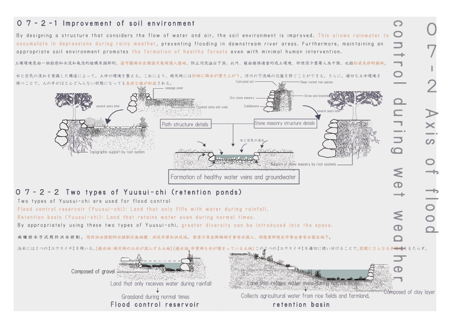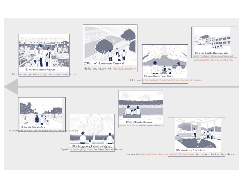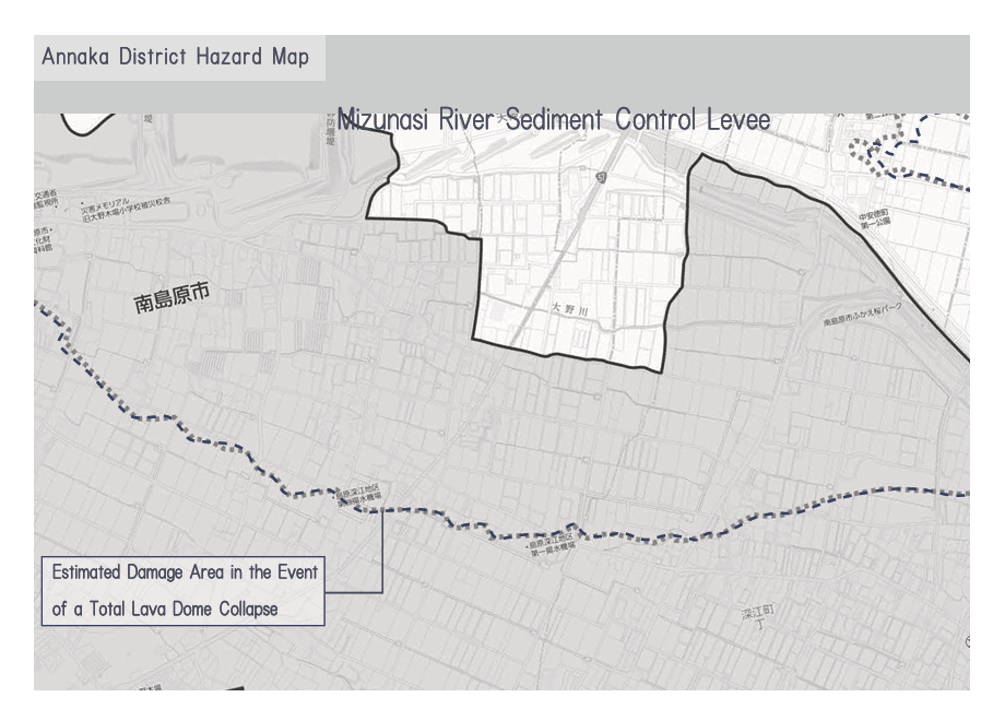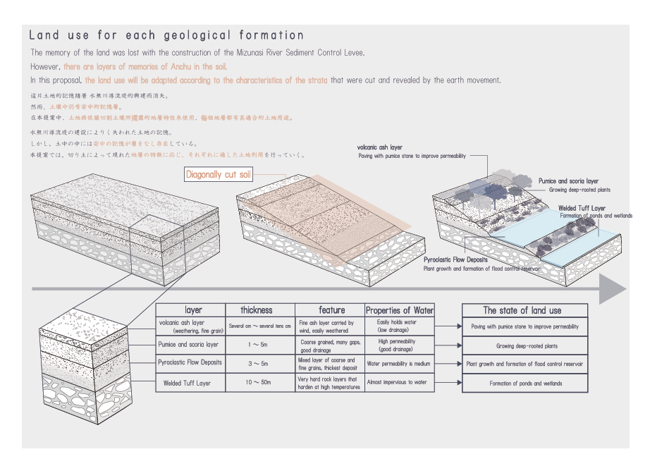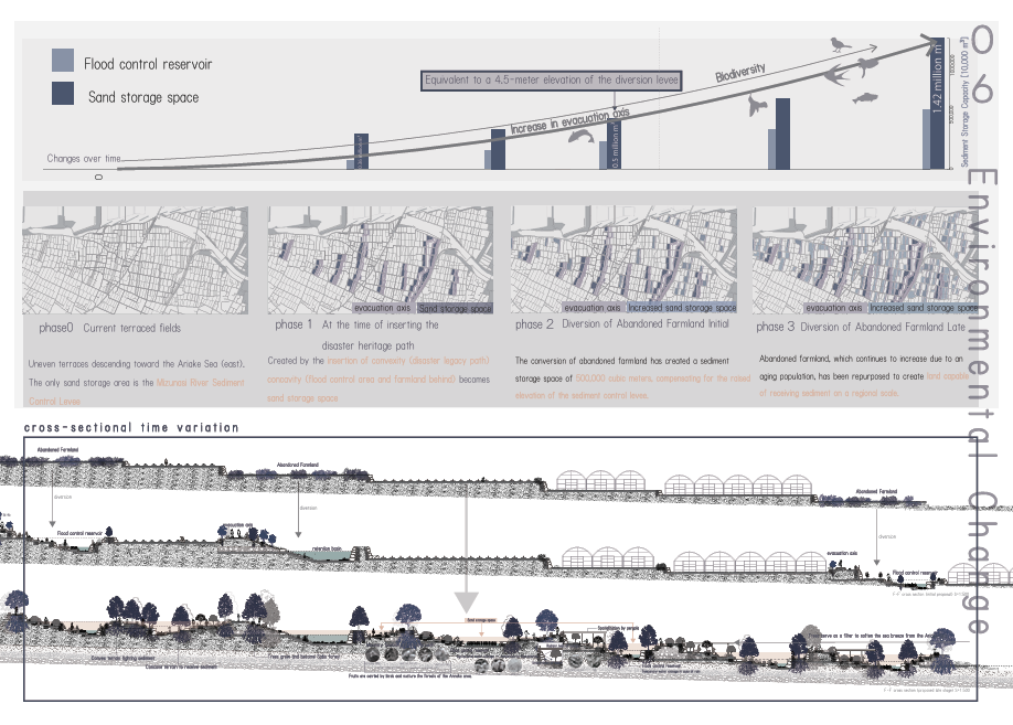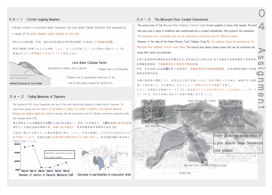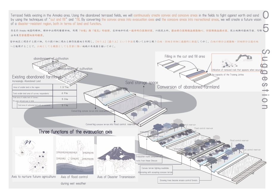 Shimabara City in Nagasaki Prefecture suffered devastating damage from the eruption of Mount Unzen-Fugen, and the lava dome “Heisei Shinzan” remains unstable today. The Mizunashigawa River Sediment Control Levee, built in preparation for future disasters, now divides the district. Rather than simply raising levees, could the land itself be shaped to receive and absorb sediment across the entire region? By applying cut and fill techniques to existing farmland, we envision a future for the Annaka area that faces disasters head-on. This is a vision of a landscape that does not treat the collapse of Heisei Shinzan as disaster, but embraces it as part of the land.