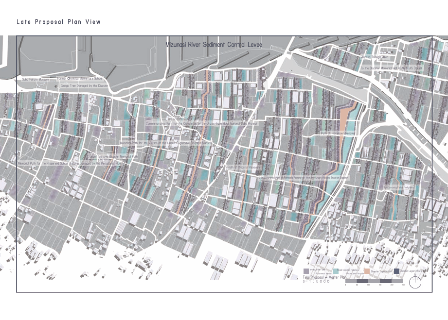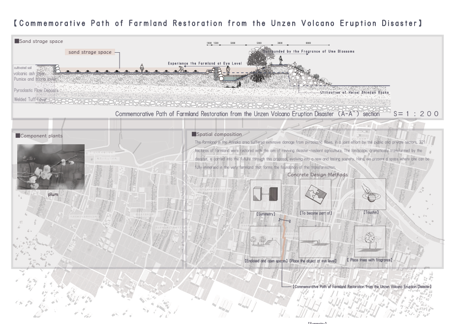 雲仙普賢岳の噴火で被害を受けた島原市には、不安定な溶岩ドーム「平成新山」が残る。分断を生む導流堤に代わり、地域全体で土砂を受け止める土地のあり方を模索する。田畑に【切り土】【盛り土】を施し、災害とともに生きる安中地区の未来を描く。