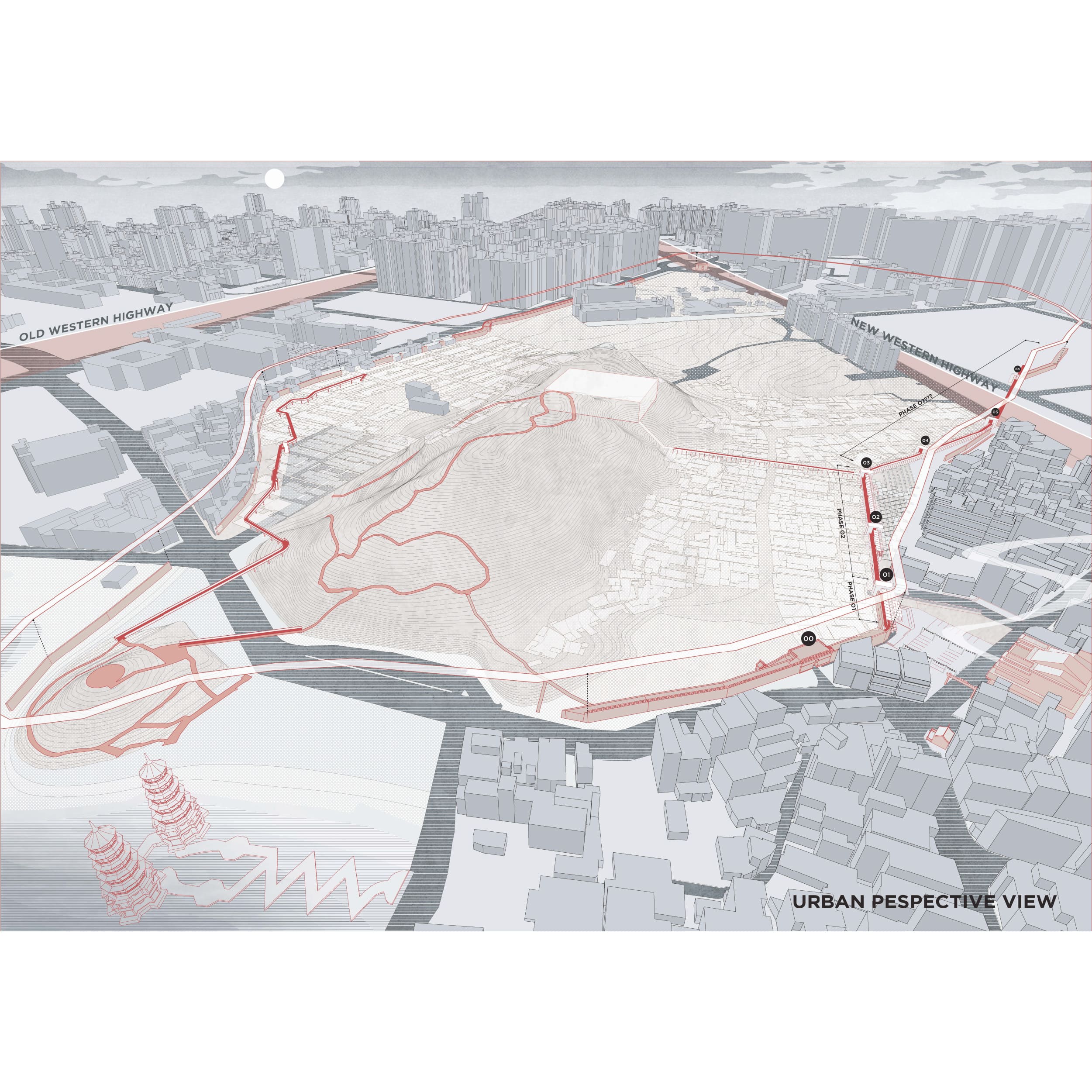 The settlement inside the city is relocated, and high-rise buildings are newly constructed on the former military dependents’ land outside the city. The design continues the prototype from Stage 1 and integrates with the existing pedestrian system, allowing the circulation around the old city to unfold. Concrete pier walls are placed at the sections where the city wall disappears. The 2.4-meter modularity frames the city’s diversity within a series of vignettes, providing a repeated view of both the wilderness and the city.