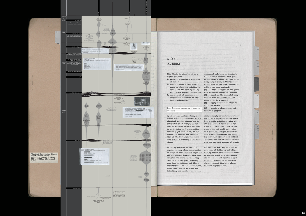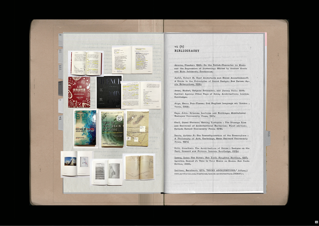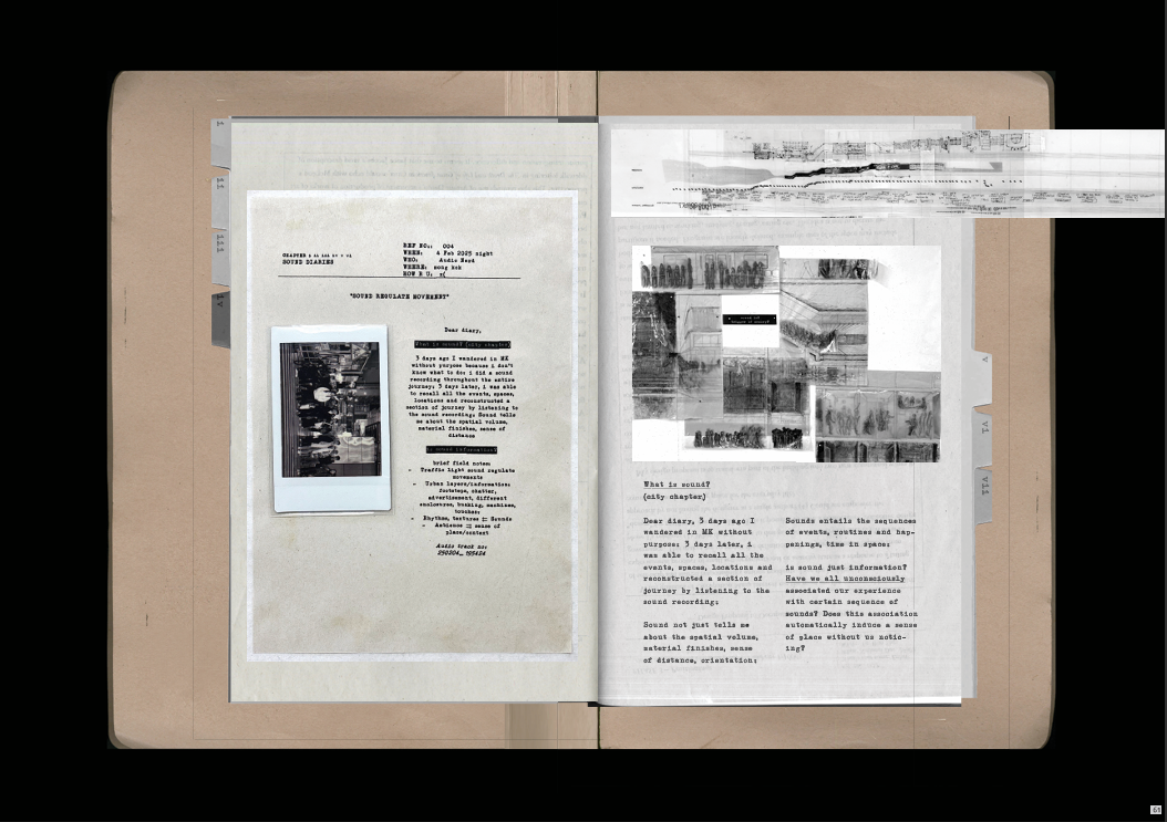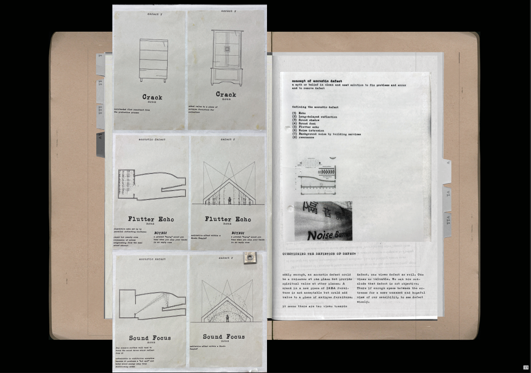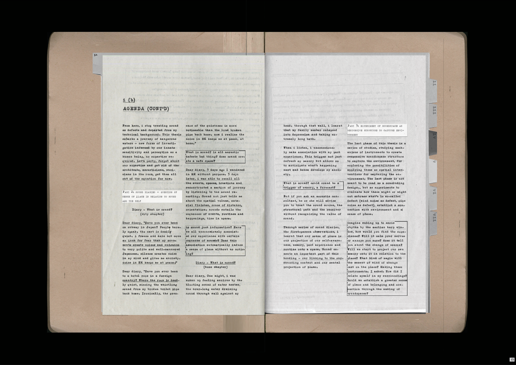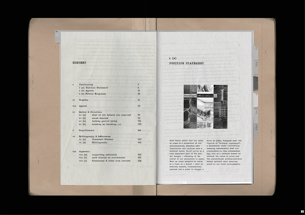 Our sense of place is a projection of our self-awareness, memories, past experiences and routines onto a physical space. Sound plays a crucial role in triggering our perception of spaces, acting as a mental switch. What we often perceive as noise, as a flaw, as a defect—what we actively isolate and unconsciously ignore—has a power to trigger a sense of places. Grappling with the urgency of Adorno Theodor’s theory of “listener regression”, a phenomenon where individuals are becoming acoustically deaf and overwhelmed in this information age, the present is a critical moment to rethink the value of sound and the conventional problem-solution design protocol when treating sound in our built environment.
