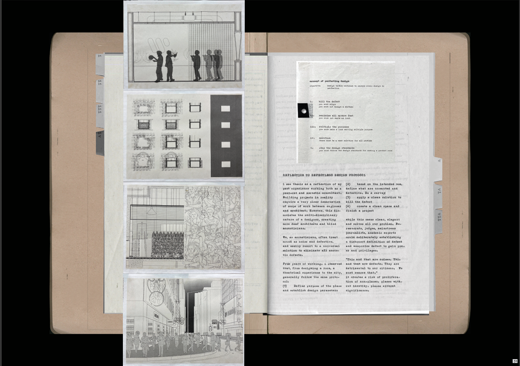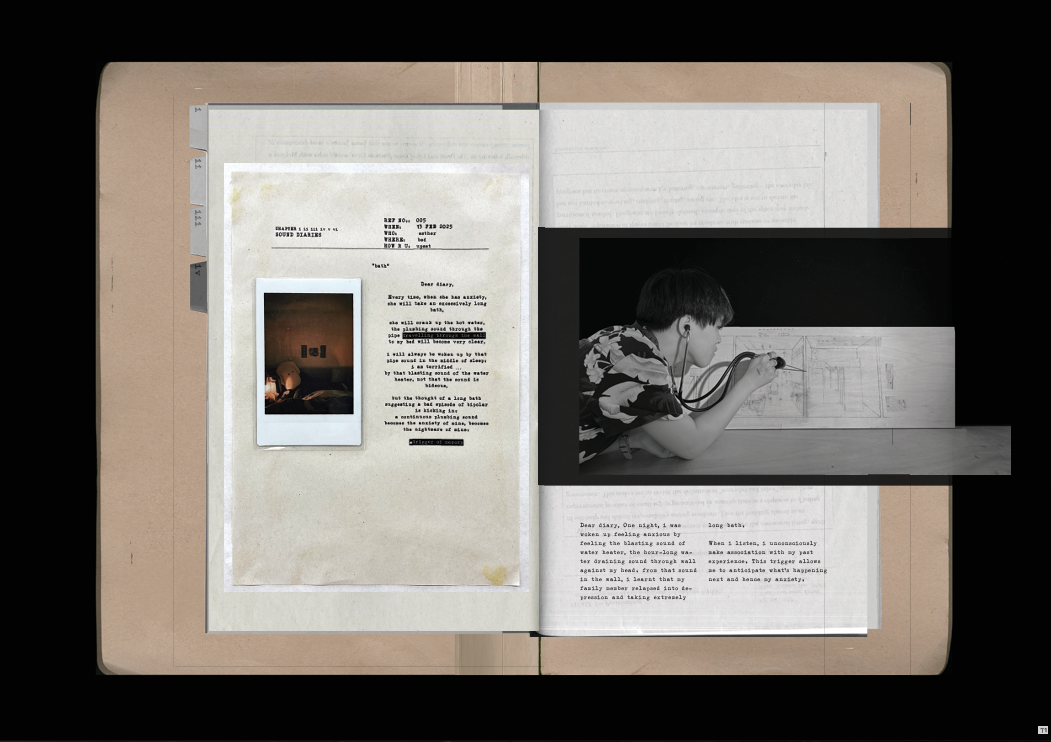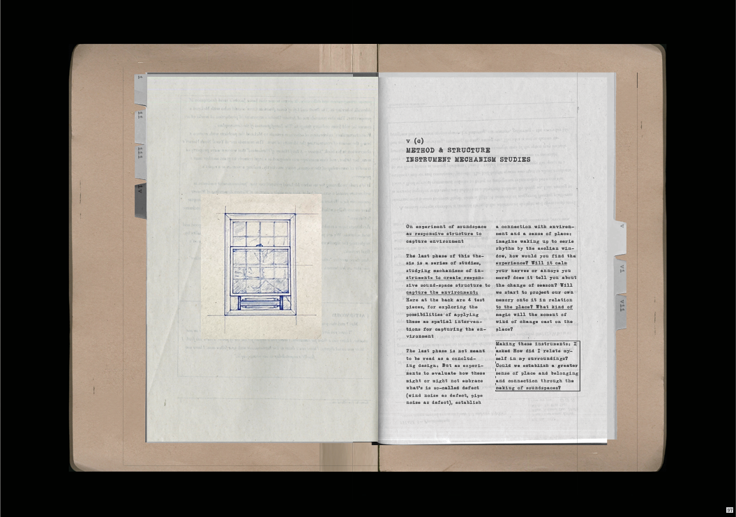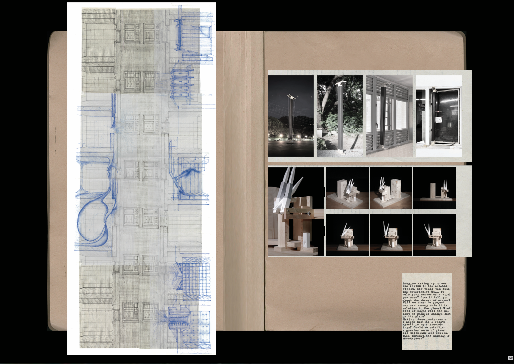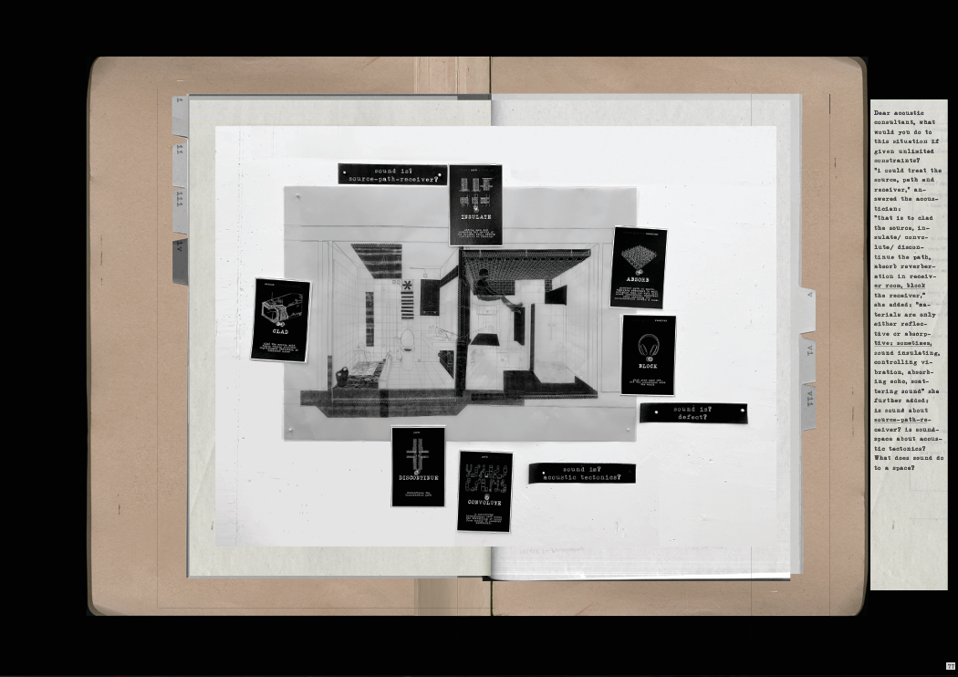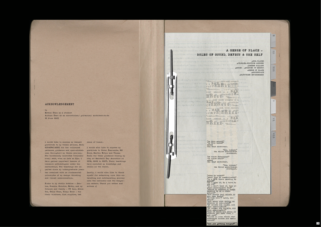 Our sense of place is a projection of our self-awareness, memories, past experiences and routines onto a physical space. Sound plays a crucial role in triggering our perception of spaces, acting as a mental switch. What we often perceive as noise, as a flaw, as a defect—what we actively isolate and unconsciously ignore—has a power to trigger a sense of places. Grappling with the urgency of Adorno Theodor’s theory of “listener regression”, a phenomenon where individuals are becoming acoustically deaf and overwhelmed in this information age, the present is a critical moment to rethink the value of sound and the conventional problem-solution design protocol when treating sound in our built environment.