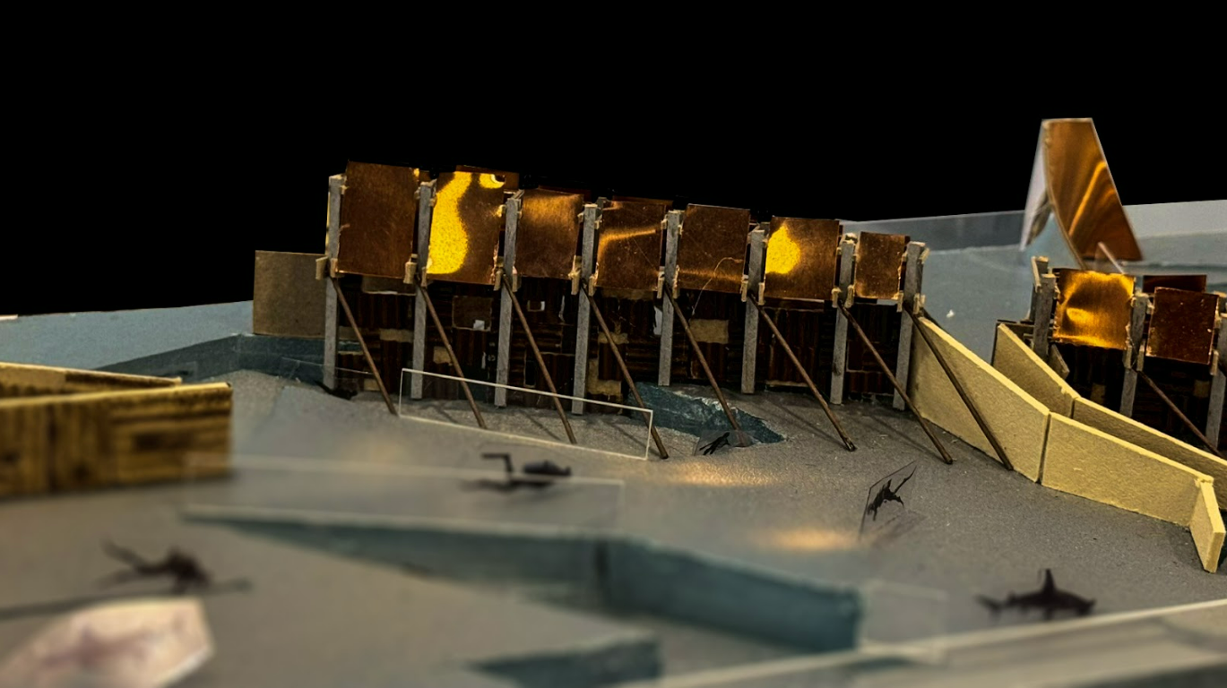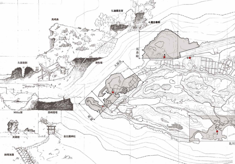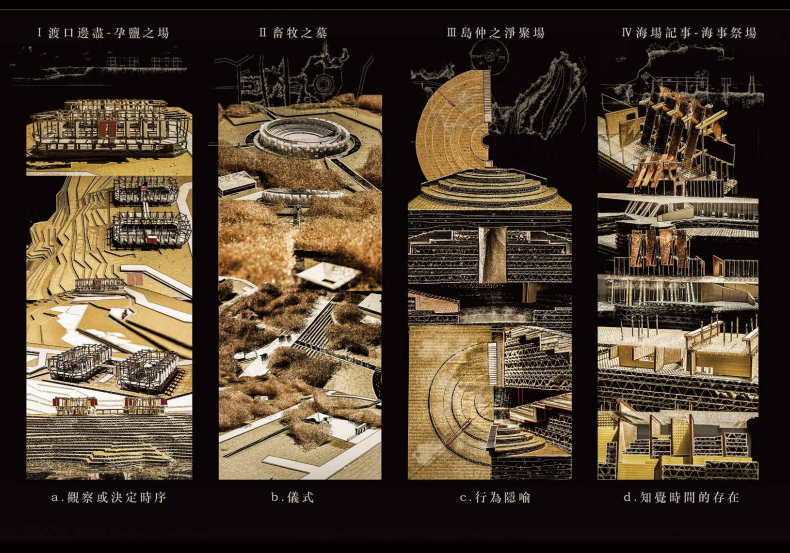 The journey begins at Kubura Port, where a former salt field is reimagined as the “Salt Birth Ground,” using wind-responsive walls to create illusions between land and sea. Moving inland, a hill in the island’s central village becomes the “Purification Assembly,” a hybrid of bathhouse and theater that invites ritual cleansing and reflection. Further south, in Sonai Village, the “Pastoral Tomb” links bullring and graveyard through an underground passage, where rainwater and glass blur the boundary between life and death. The path ends at the island’s submerged ruins, transformed into the “Maritime Ritual Grounds,” where glimmers of fishing fire reflect off copper surfaces and awaken collective memory.