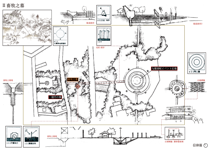 其下的祖那村擁有鬥牛場與墓地群,設計於其間構築「畜牧之墓」,地底通道連接生死兩端,以霧玻璃圍牆與雨水作用呈現人與自然的消融與融合,並引島上祭儀河川灌沐此場域。