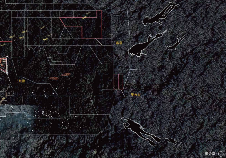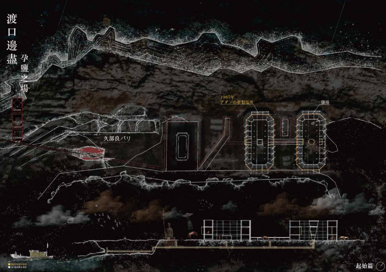 最終來到島嶼南側海底的古文明遺址,轉化為「海事祭場」。於傍晚時分,捕魚火光映照於銅面,微光灑落海面,如喚醒沉沒記憶般啟動產業儀式,將過去拜所幻化為未來可被閱讀的事件場域。