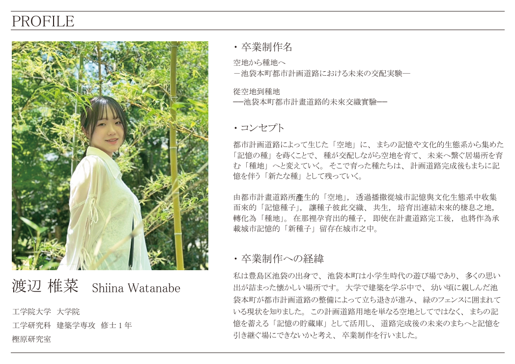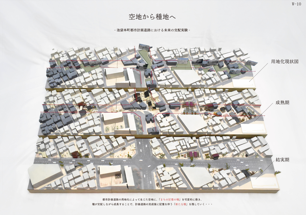 都市計画道路による空地を「種地」と捉え、地域の記憶を「記憶の種」として蒔き交配させることで、未来の居場所を育てる提案です。物語や風景を引き継ぎながら、地域とともにまちを再生する新たな都市計画のあり方を示します。