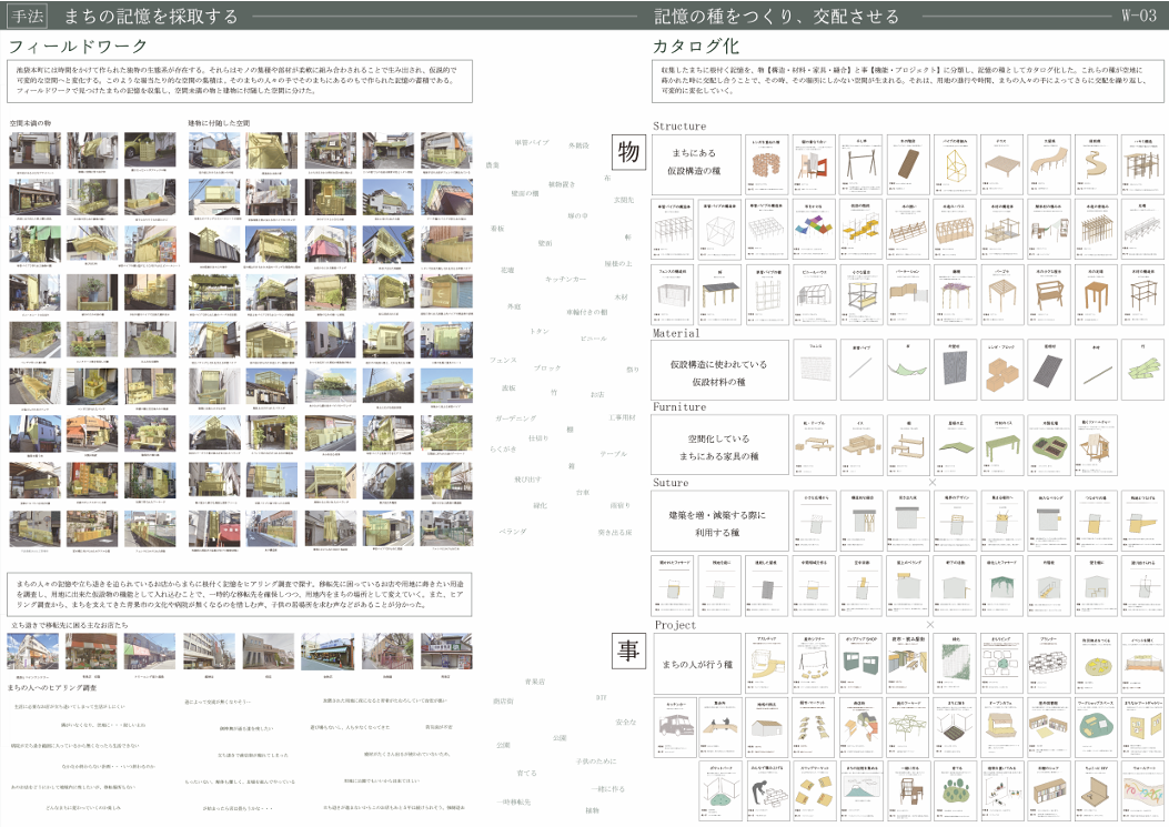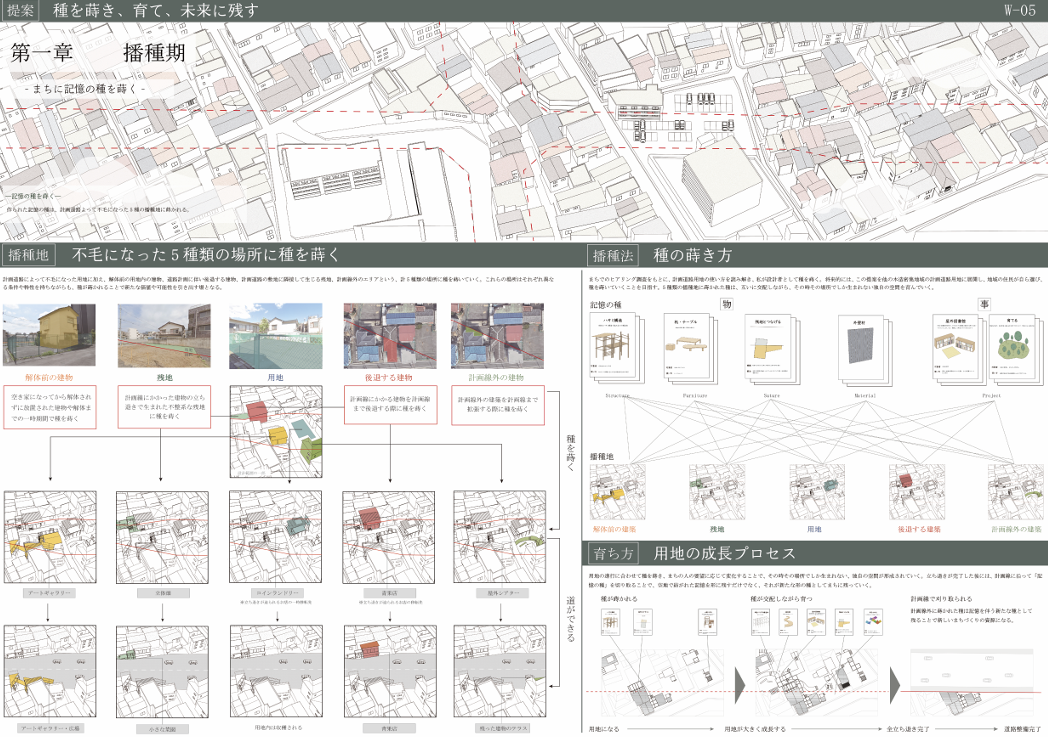 本提案將因都市計畫道路而產生的空地視為「種地」,並把地區的記憶當作「記憶之種」播下並進行交配,藉此孕育未來的棲居場所。透過延續在地的故事與風景,提出一種與地方共生、共同再生的全新都市計畫模式。