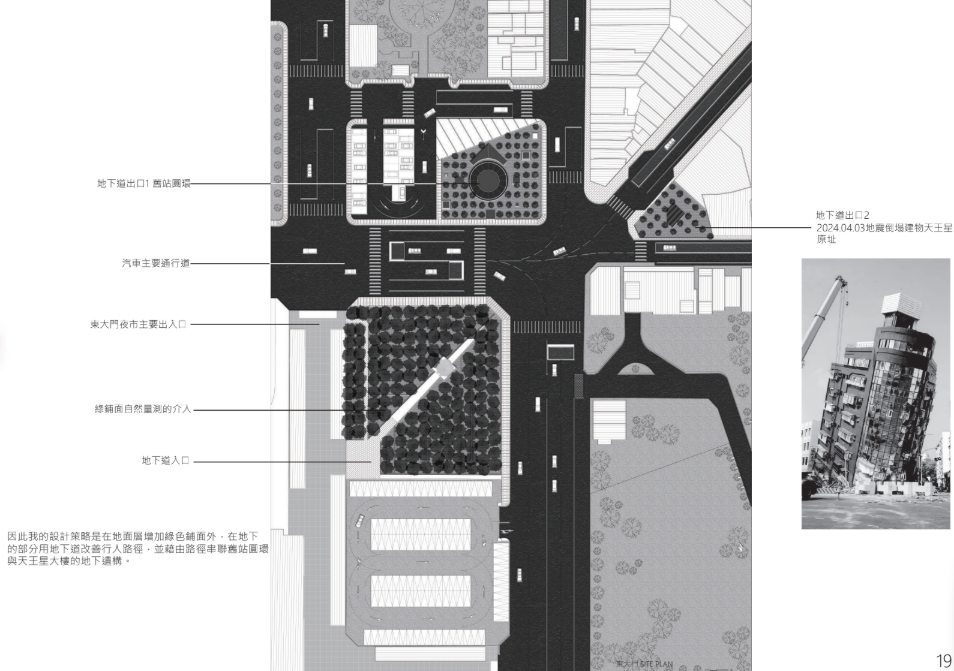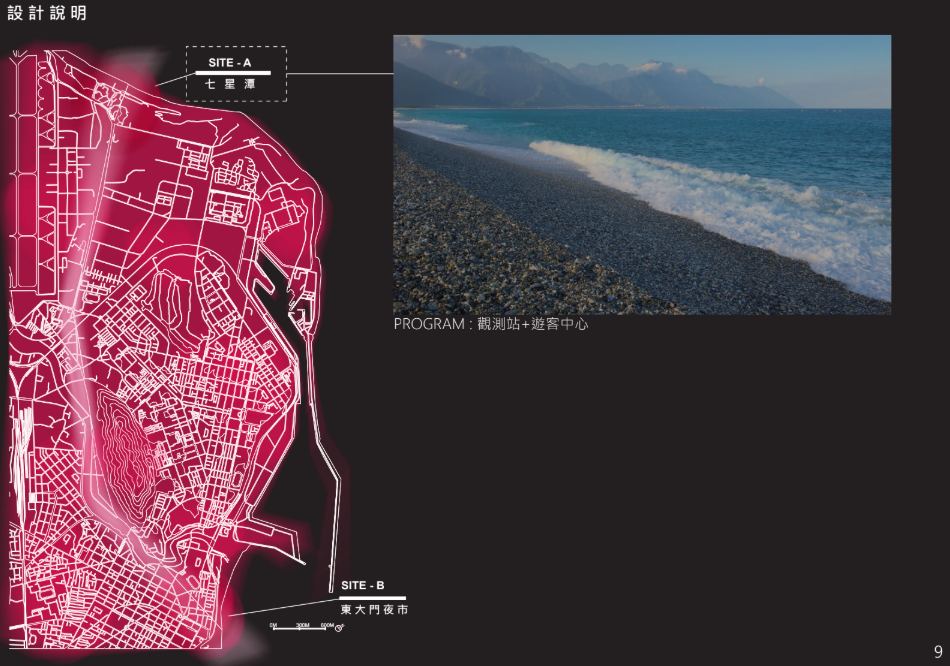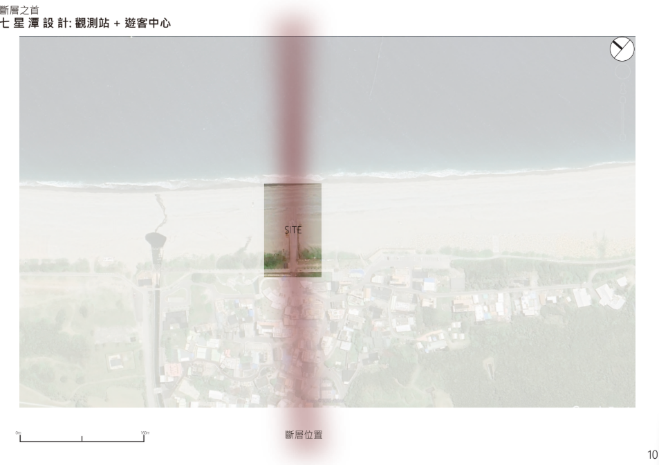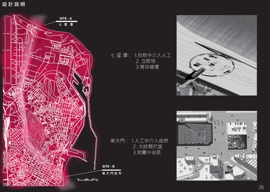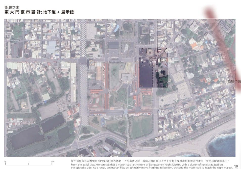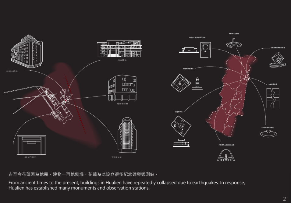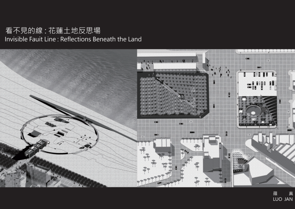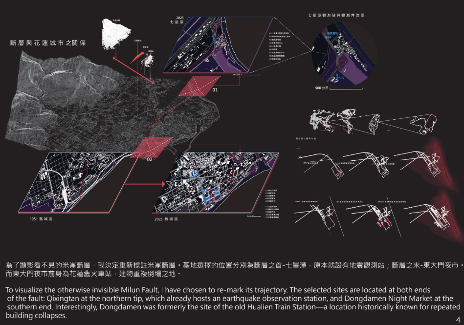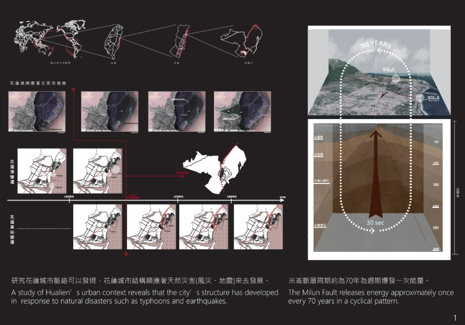 自身過往生命經驗,我關注到同為無可避免的瞬間,可能是一場天災、一場人禍。台灣有一個城市叫花蓮,對於花蓮我們的印象應是好山好水,但其實美好的背後,卻是承載著全台灣最多天然災害的土地,尤其當4月3號的大地震瞬間摧毀了對於當地精神象徵的太魯閣。透過研究花蓮的城市脈絡,可以得知花蓮現在的紋理是順應著天災而成,一條米崙的斷層通過花蓮市中心,其發震率高達88%,這也正是花蓮如此無常的原因,當地震一再發生,同一塊土地上的房子重複倒塌,差別只是經過了70年。我想做的是如何喚起人們僅存在於瞬間所擁有的記憶與感知、如何來去記得,透過空間、場域、裝置等,讓人們用身體來去記得。 嘗試重新標註米崙斷層,兩點成一線,兩個截然不同的基地分別位於斷層的頭跟尾,分別為自然環境的七星潭與舊市中心的東大門夜市,這兩處恰好都是遊客聚集之處。而七星潭基地處有一個最新科技的光纖觀測站,東大門夜市有一個不斷見證變動的不變圓環紋理。因此在七星潭所設置的機能為地震觀測站+遊客中心,在自然當中做人工的介入;在東大門夜市出入口做公園+地下道,在人工當中做自然的介入。七星潭的地震觀測站屬於立即性的感知,而東大門夜市區屬於大尺度的時間設計。