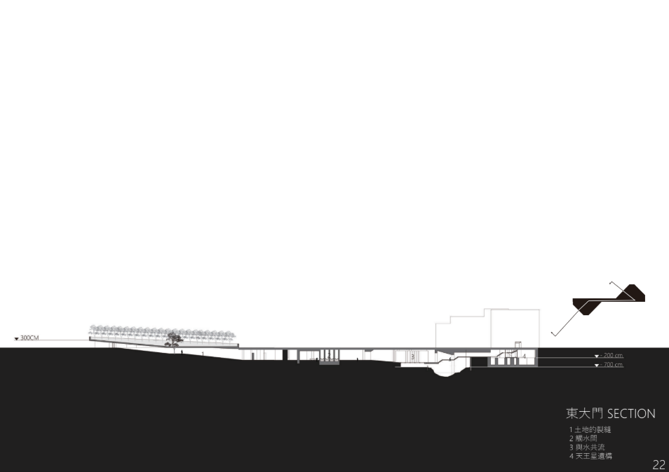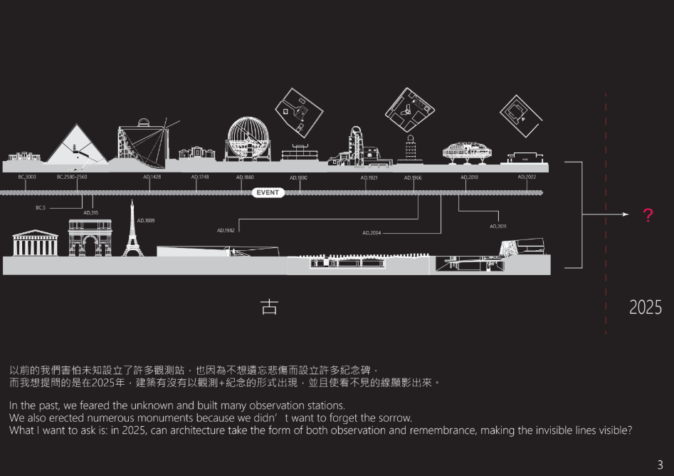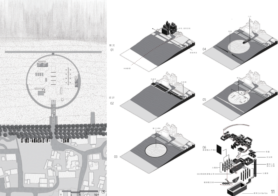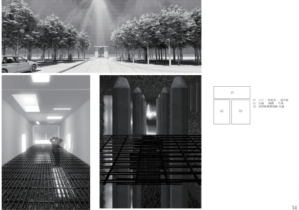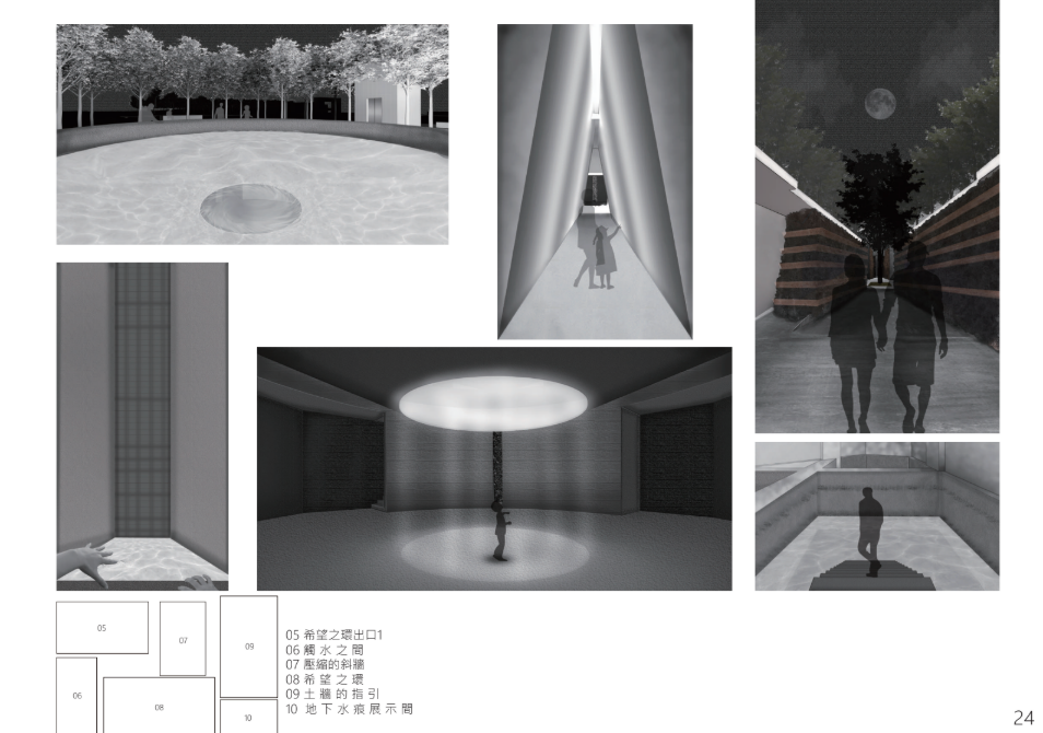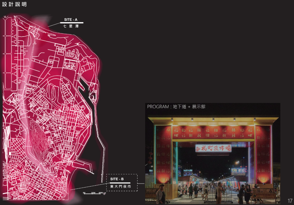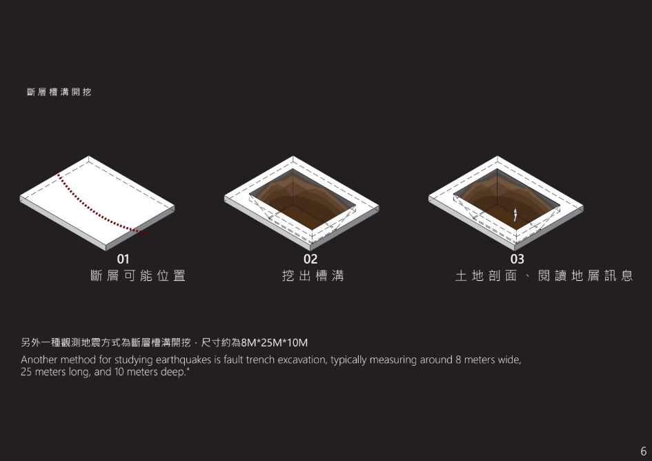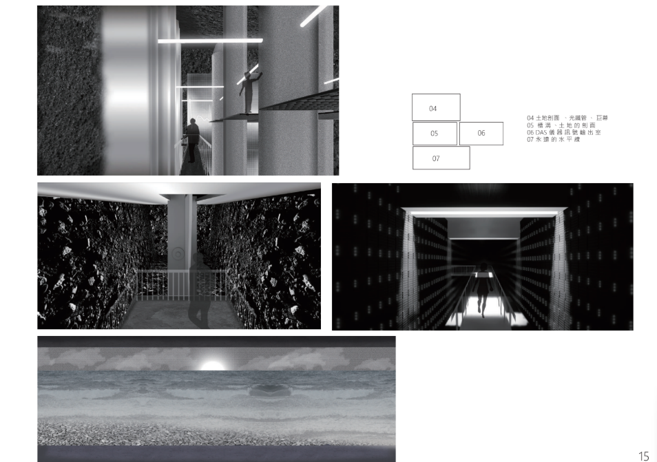 自身過往生命經驗,我關注到同為無可避免的瞬間,可能是一場天災、一場人禍。台灣有一個城市叫花蓮,對於花蓮我們的印象應是好山好水,但其實美好的背後,卻是承載著全台灣最多天然災害的土地,尤其當4月3號的大地震瞬間摧毀了對於當地精神象徵的太魯閣。透過研究花蓮的城市脈絡,可以得知花蓮現在的紋理是順應著天災而成,一條米崙的斷層通過花蓮市中心,其發震率高達88%,這也正是花蓮如此無常的原因,當地震一再發生,同一塊土地上的房子重複倒塌,差別只是經過了70年。我想做的是如何喚起人們僅存在於瞬間所擁有的記憶與感知、如何來去記得,透過空間、場域、裝置等,讓人們用身體來去記得。 嘗試重新標註米崙斷層,兩點成一線,兩個截然不同的基地分別位於斷層的頭跟尾,分別為自然環境的七星潭與舊市中心的東大門夜市,這兩處恰好都是遊客聚集之處。而七星潭基地處有一個最新科技的光纖觀測站,東大門夜市有一個不斷見證變動的不變圓環紋理。因此在七星潭所設置的機能為地震觀測站+遊客中心,在自然當中做人工的介入;在東大門夜市出入口做公園+地下道,在人工當中做自然的介入。七星潭的地震觀測站屬於立即性的感知,而東大門夜市區屬於大尺度的時間設計。