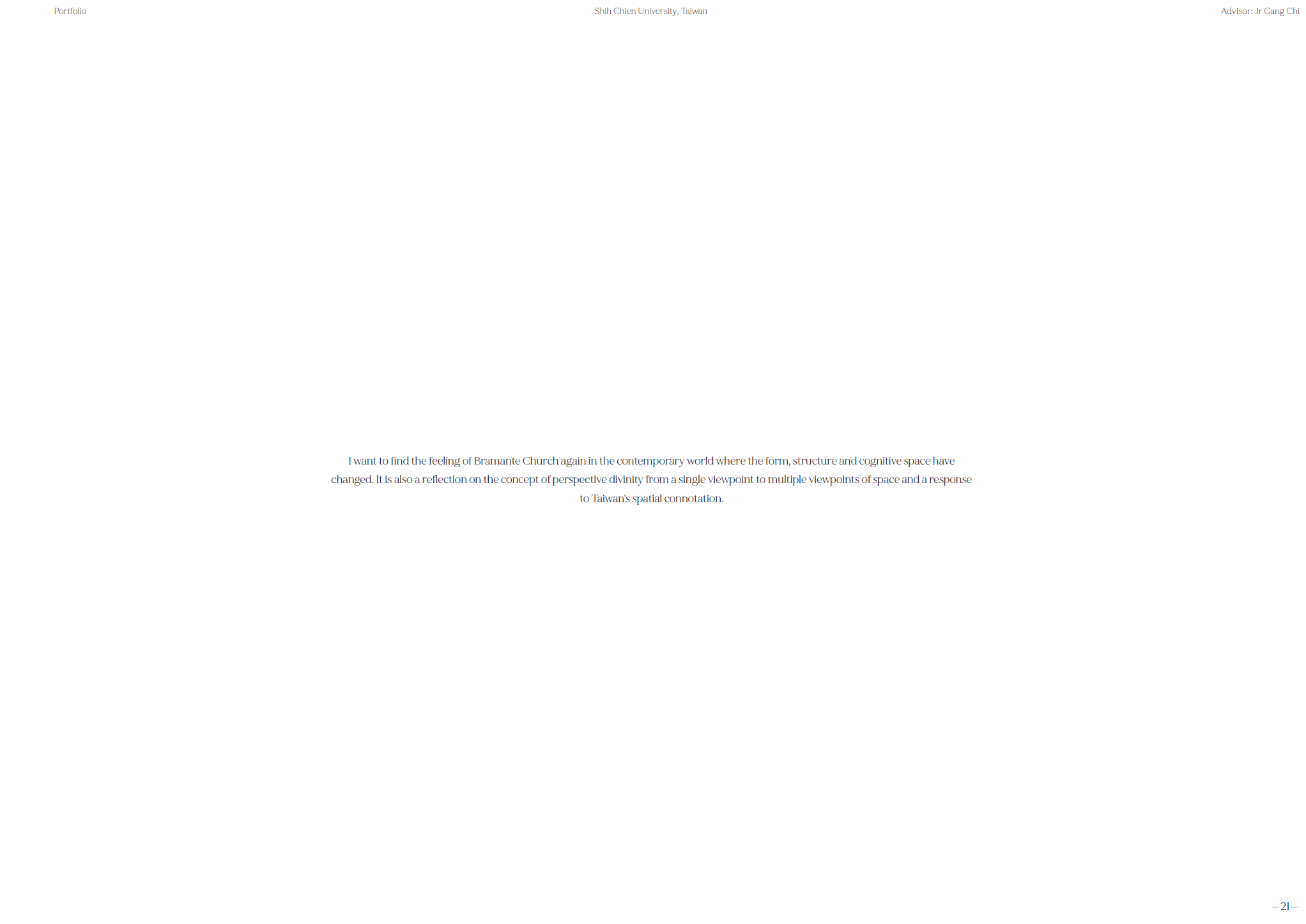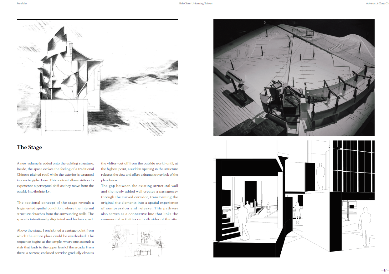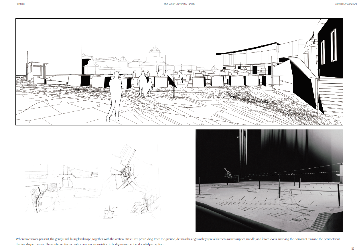 在新竹天公壇前廣場,從下層地面的軸線轉向和地景傾斜;中層構造物形成的場域和感知的邊界;到上層偏心弧形廊道和戲台定義廣場介面的建築體,共同建構抽象空間。同時讓被壓抑的戲台重新得到紀念性,以及讓原先廢棄的拱廊結構透明的串連旁邊公園和各種在地活動。是對於透視法的批判、探索西方單一視點空間以及台灣都市涵構之間的永恆與變動,也是想試圖找回當初於Siena的感動。