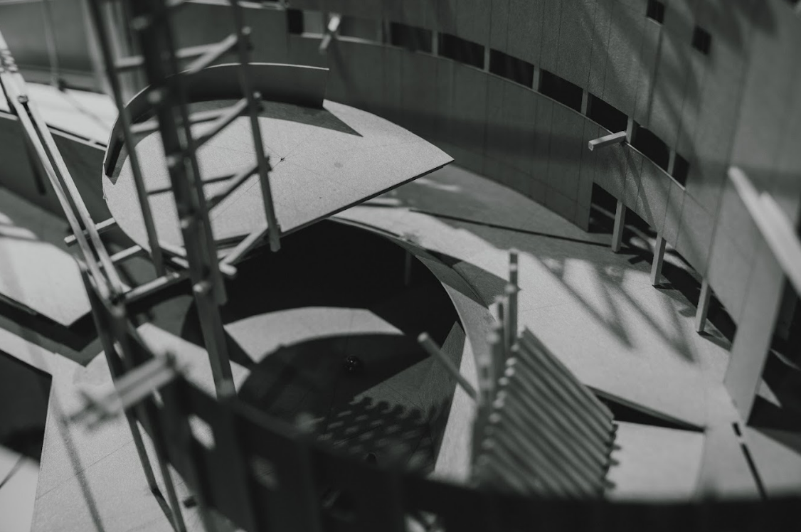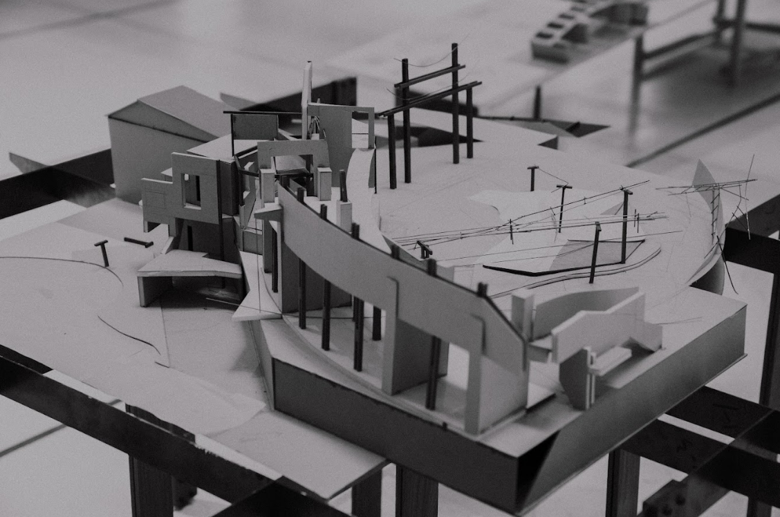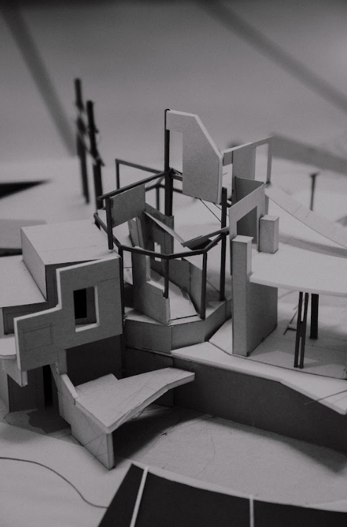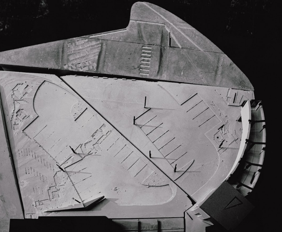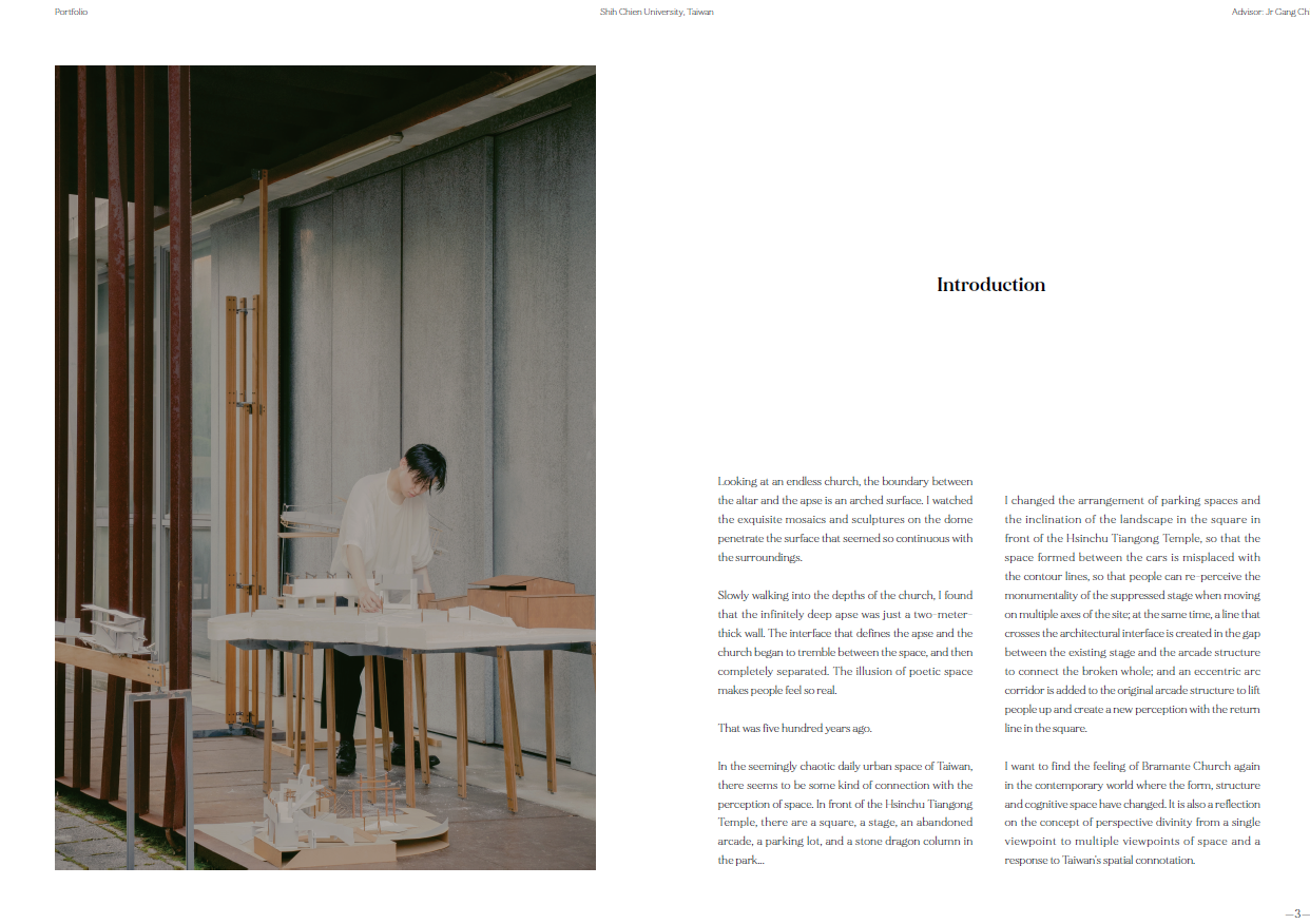 在新竹天公壇前廣場,從下層地面的軸線轉向和地景傾斜;中層構造物形成的場域和感知的邊界;到上層偏心弧形廊道和戲台定義廣場介面的建築體,共同建構抽象空間。同時讓被壓抑的戲台重新得到紀念性,以及讓原先廢棄的拱廊結構透明的串連旁邊公園和各種在地活動。是對於透視法的批判、探索西方單一視點空間以及台灣都市涵構之間的永恆與變動,也是想試圖找回當初於Siena的感動。