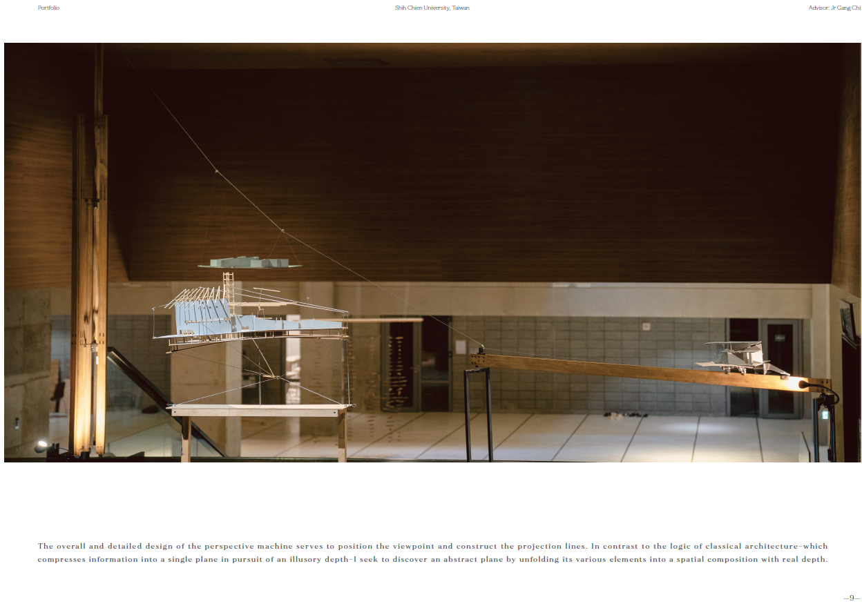 現在,我先透過透視機器製作以及身體於Siena山城中移動產生的透視變化所繪製的感知地圖,來研究不同深度的資訊投影於人感知到空間的瞬間切面上所形成的不可視空間結構,一個真實與想像共存的空間。再將這樣的空間概念表達於看似紛亂的台灣日常都市空間。