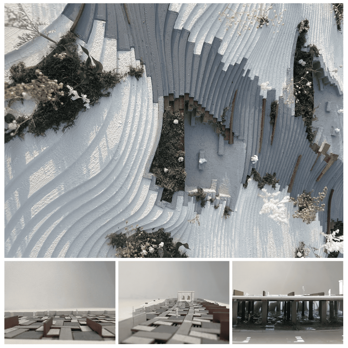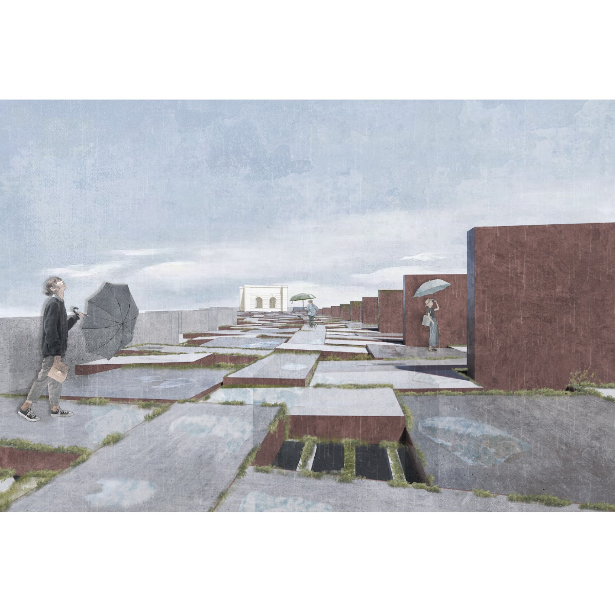 建築的輪廓隨時間流逝被自然模糊邊界。人的行走軌跡隨時間推移,在植物和水的介入產生不同路徑,每次行走都在找尋建築與自然的平衡。同時讓人關注不易察覺的微差,每個微小變化不斷的累積將形成無法預測的巨大變異。