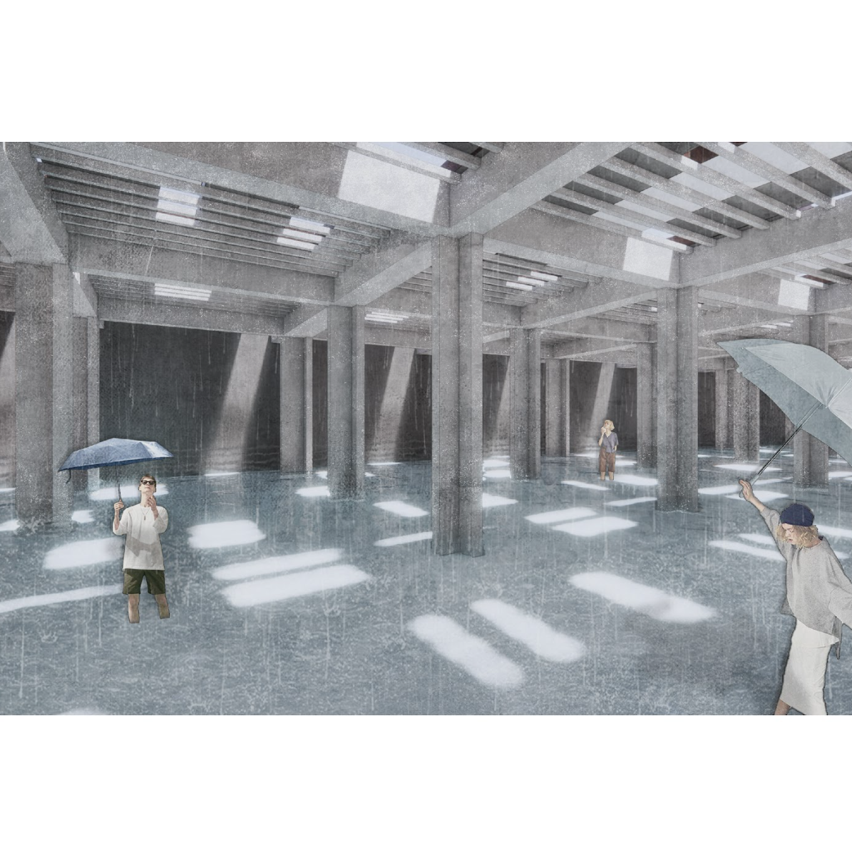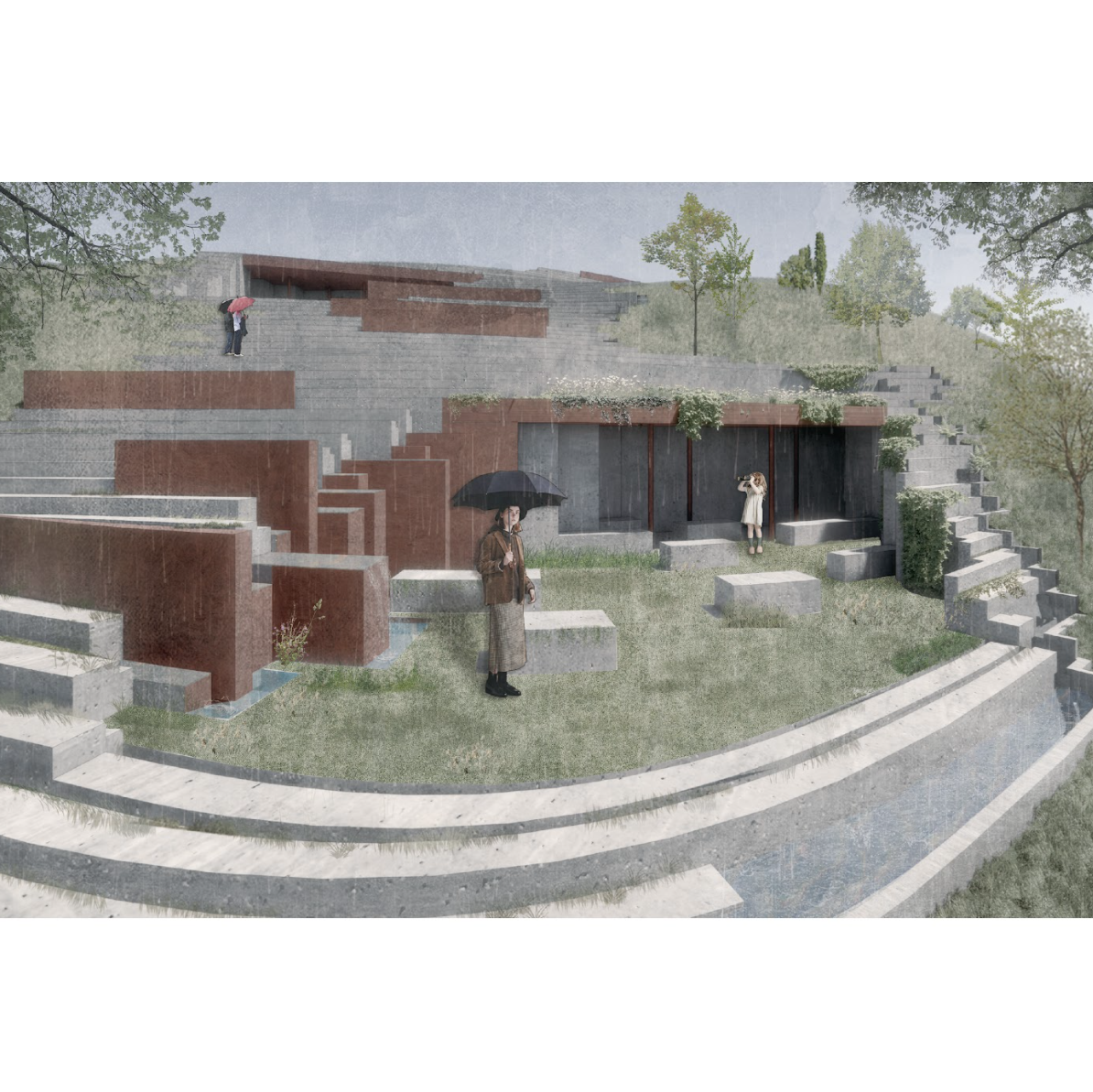 The building’s contours blur with time and nature. As people move, their paths shift with the influence of plants and water, each walk seeking harmony between architecture and nature. This process draws attention to subtle changes, where accumulated small shifts lead to unpredictable transformations.