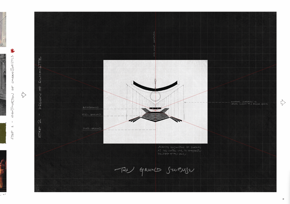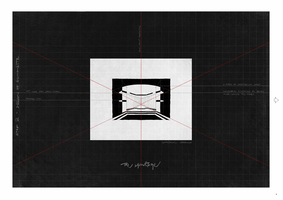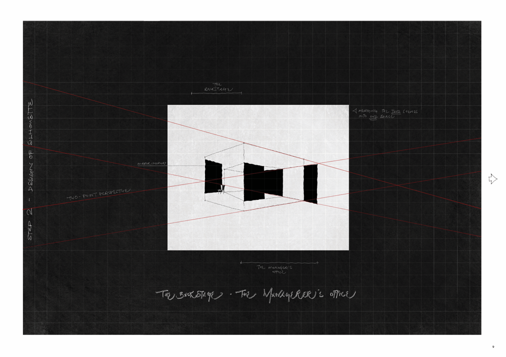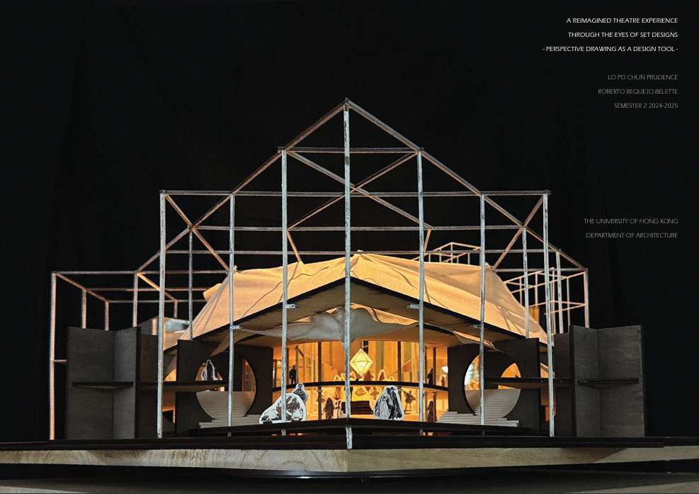Theatre spaces reveal themselves as a space composed of thresholds and framed views. Theatregoers spend most of the time in the auditorium, experiencing the entire journey from a fixed perspective. This typical theatre setting limits the interaction between theatregoers, performers, and the designed space. This project explores the potential of perspective drawings, a methodology-driven study that encourages intuitive and active participation in image creation that influences human experience within a theatre space. Through studying set designs of Giuseppe Galli Bibiena, a methodology was developed through dissecting his perspective drawings. Attaching myself to one of the classics: The Phantom of the Opera, this methodology was applied to design spaces by reversing the process of the study. Each drawing developed from silhouettes of openings and surfaces is then collaged in sequence as a guide, shaping an immersive performance environment that exhibits a continuous sequential and participatory theatre-going experience. The architecture of theatre has historically been characterised by its ability to frame narratives through spatial and visual constructs. Traditional proscenium stages, defined by fixed sightlines and rigid geometries, have conditioned audiences to engage with performances primarily as passive observers rather than as active participants. This project aims to interrogate the conventional theatre experience by reimagining set design through the framework of perspective drawing—a methodology that not only shapes spatial arrangements but also influences perception and engagement. In traditional theatre practice, the architect is responsible for designing the structural container (the building), while the scenographer focuses on the content (the stage). This project seeks to dissolve that division by allowing the architectural qualities of scenic drawings to exert a designed influence on theatre spaces, thereby positioning architecture itself as a form of scenography.