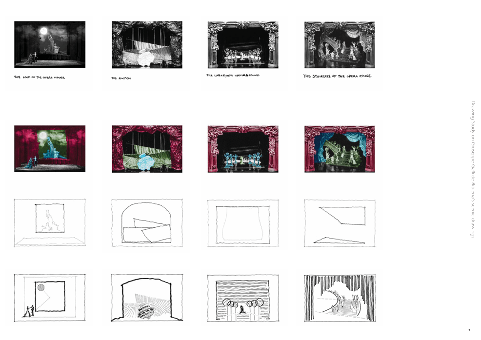 透過對巴洛克舞台設計師朱塞佩・加利・比比納(Giuseppe Galli Bibiena)舞台設計的研究,本論文發展出一套透視法的方法論。透過解析比比納的透視圖,並以經典作品《歌劇魅影》作為實驗對象,反向運用所建立的方法來進行空間設計。每張圖像由開口與表面輪廓的剪影構成,並依序拼貼,形成引導性的敘事路徑,構建出連續而沉浸的表演環境,重新定義了觀眾參與劇場的經驗。