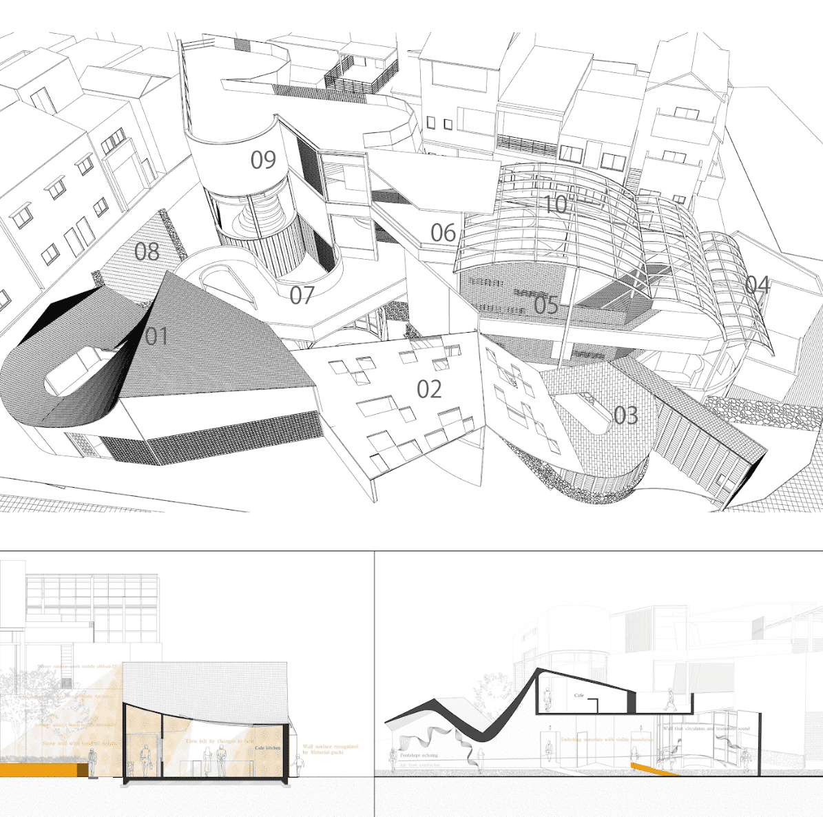The more visual advances we make, the more the visually impaired, who are a visual minority, are left behind, and we are living in a society where they can only be helped in facilities. In response to this problem, I consider visually impaired people who live mainly by touch to be “Shokujosha”, and build a city based on touch. At the school for the blind, I conducted research from the perspective of hearing and pressure, and by drawing and frottage on the Uemachi Plateau, I reexamined the city from a tactile perspective. Based on these, I proposed “three points of Shokujosha”, and designed it with the aim of creating a new space not only for Shokujosha but also for able-bodied people.